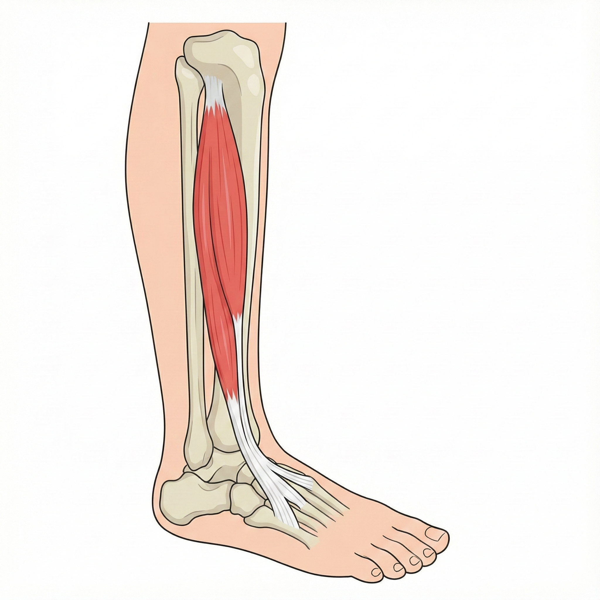 場所: すねの骨の前外側に位置し、腱は足の甲の内側に付着します。